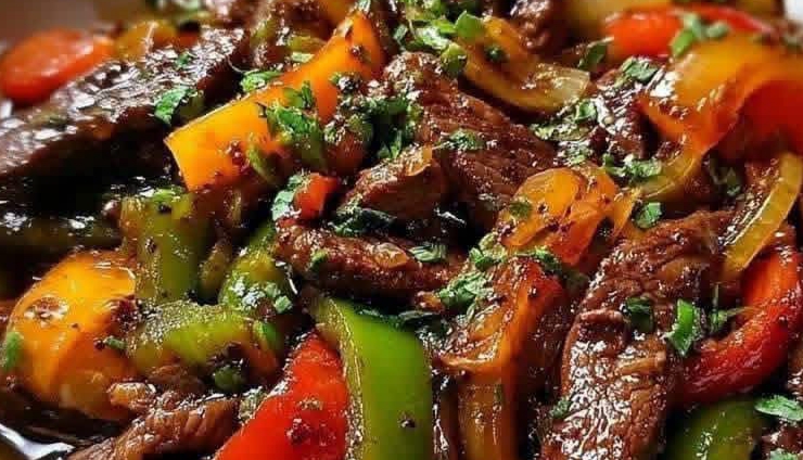 Peel and slice the onions. Wash, dry and thin the cilantro.Cut the meat into strips and place it in a deep dish. Spread the sliced onions over the meat, drizzle with a tablespoon of soy sauce, a tablespoon of peanut oil, a tablespoon of water, sprinkle with pepper and cornstarch and mix good. Let to marinate for 20 min in fridge.Cooking rice according to instructions on packet.At the same time, heat two tablespoons of oil in a wok or large skillet, sauté the beef in small batches for 2 minutes.Remove the meat from the wok, pour a tablespoon of oil and sauté the onions for 5 minutes. Pour in the marinade juice and bring to a boil.Then add the meat, salt, pepper and cook for 2 minutes. Place the rice in bowls.Divide the meat with the onions among the plates. Drizzle with sauce. Garnish with coriander sprigs. Serve hot.