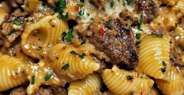 Ingredients 12 oz shell pasta 1 lb steak (sirloin or ribeye) , cut into bite-sized pieces Salt & black pepper…